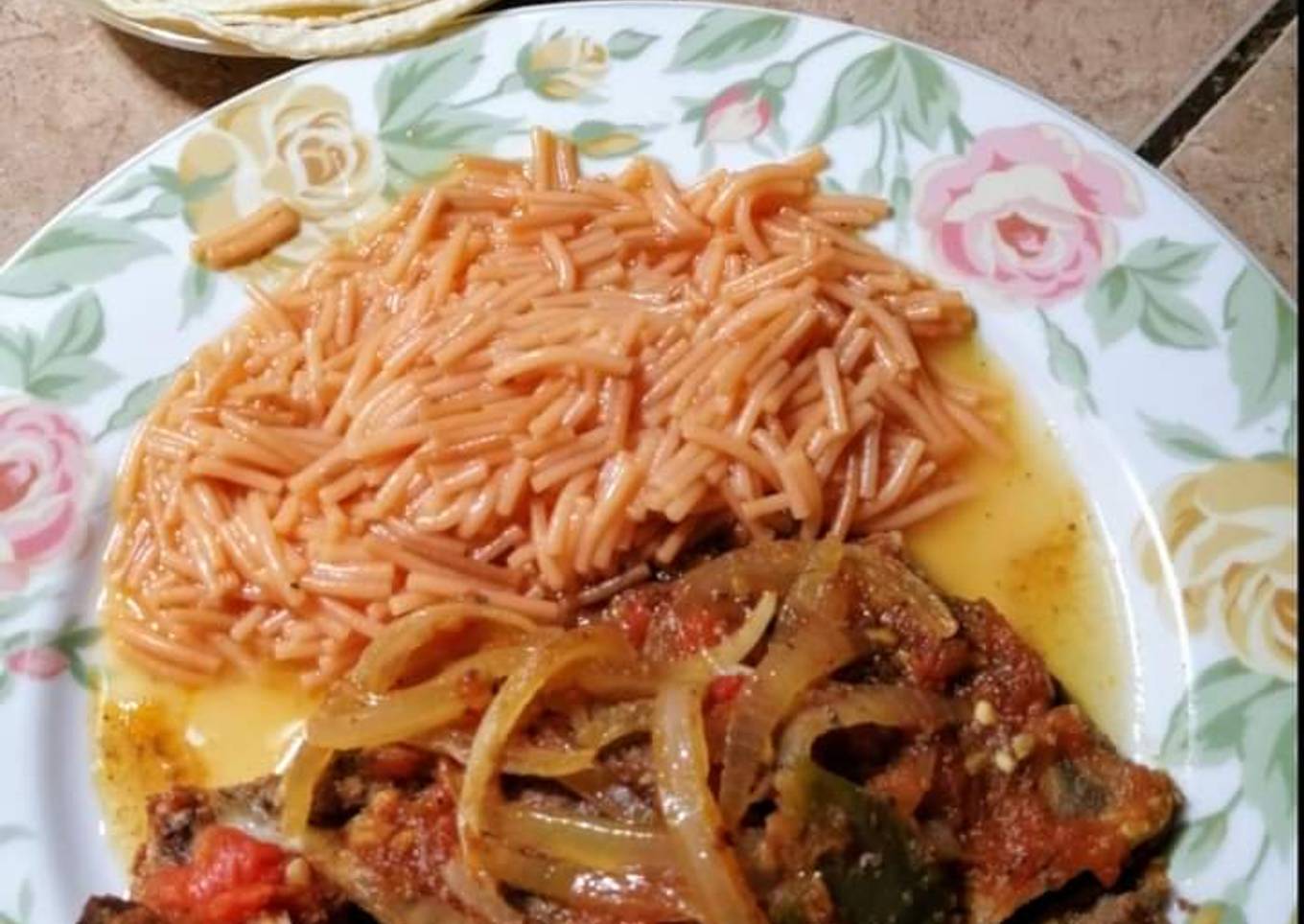 Guiso de bistec a mi estilo y sopa de fideo para acompañar