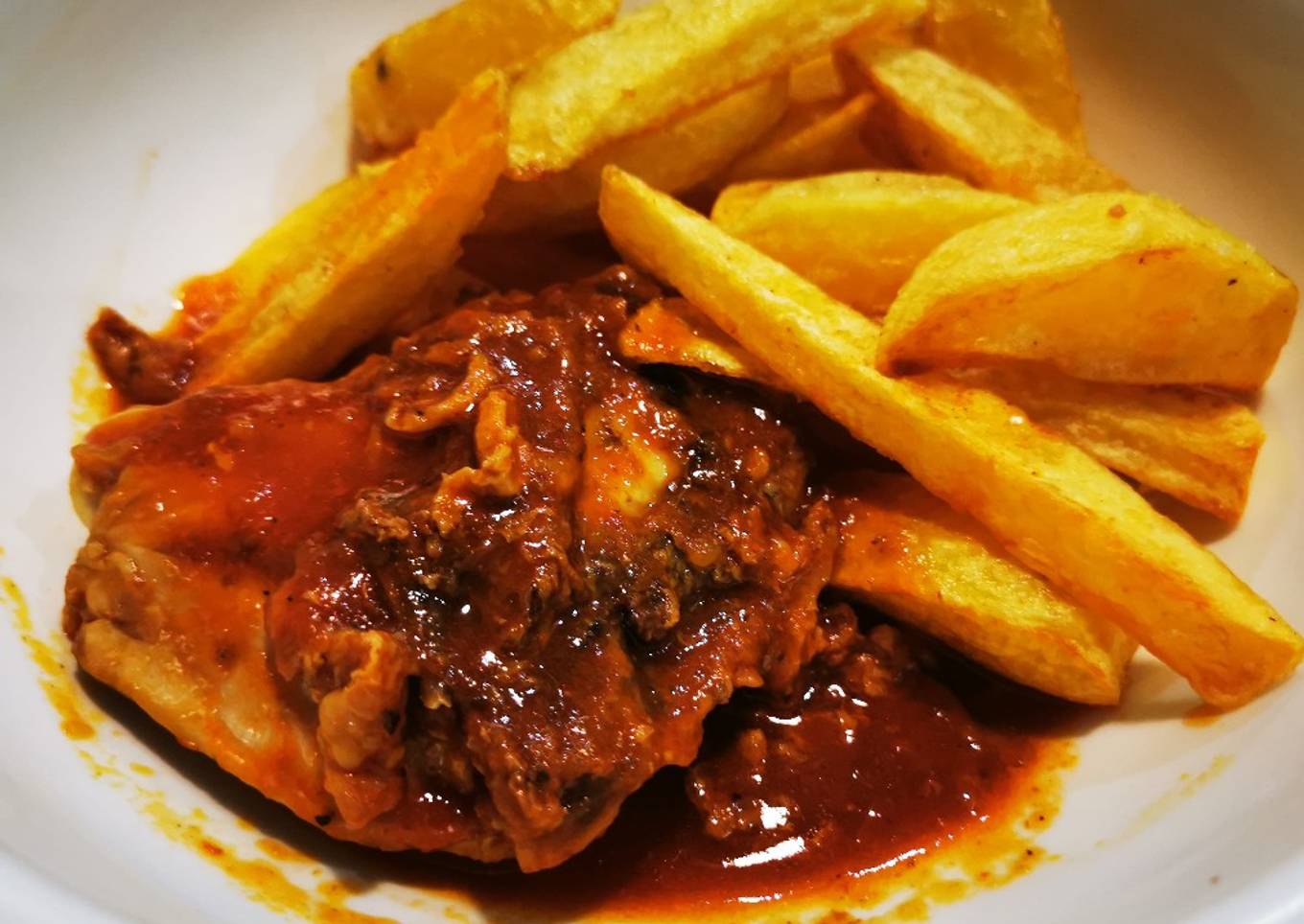 Pollo Frito en Salsa de Tomate & Papas Fritas