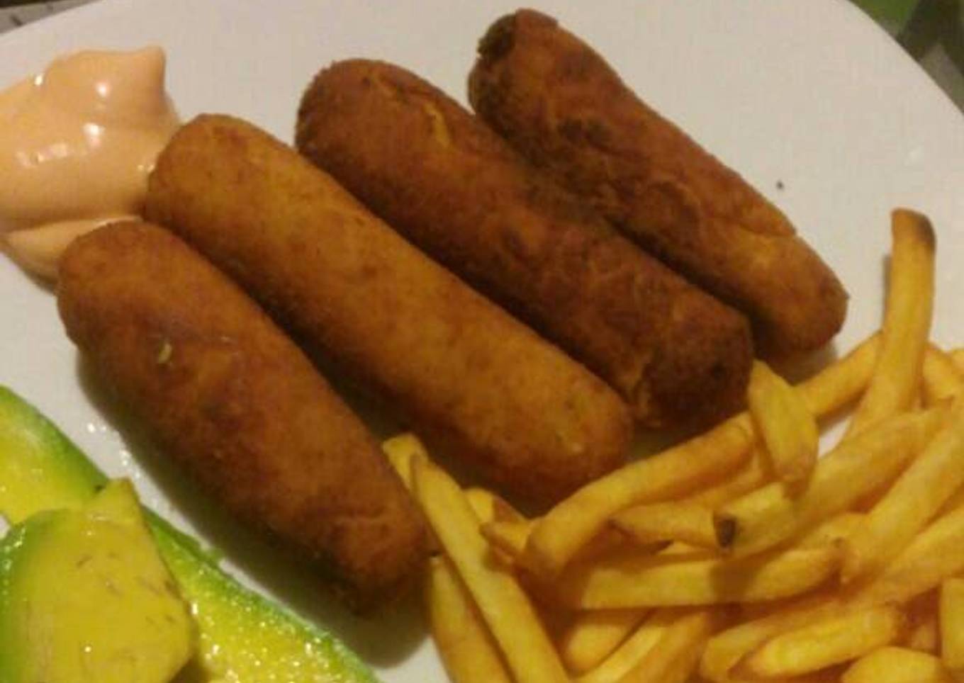 - Cuando esté bien cocida la masa apartar del fuego, cubrir para evitar que se forme costra y dejar enfriar. Prepare 2 huevos batidos con un chorrito de leche, ponga harina y miga de pan en platos diferentes, con la masa fresca tome cucharadas y forme bolitas con las manos, ruédelas sobre la harina para formar cilindros y asà se le pegarån menos de las manos, pase el cilindro por el huevo y luego por el pan rallado, repita el proceso hasta que termine toda la masa