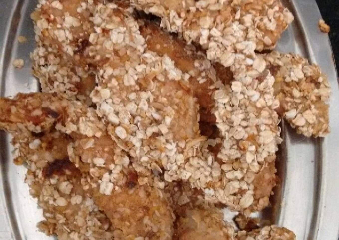 - Cortar el pollo en tiras. Condimentar el huevo con lo que quieras, yo use orégano y ají molido. Y use para rebozar avena, copos de maíz sin azúcar y cebolla deshidratada.
