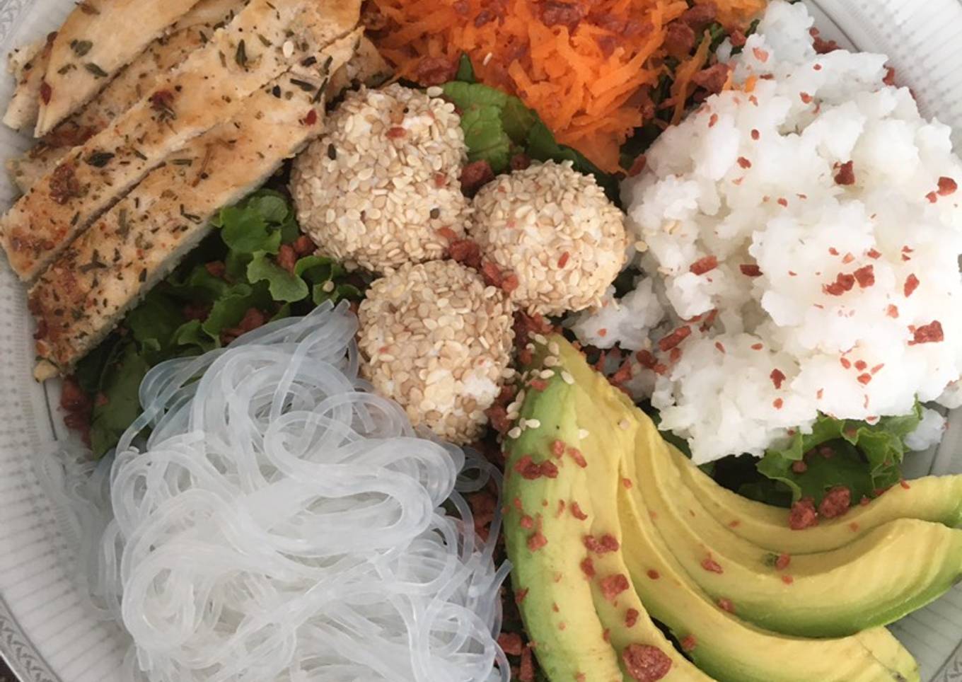- Comenzamos a armar nuestra ensalada. Primero colocamos en cada plat贸n hondo o bowl una capa de lechuga, luego espinaca y encima colocamos el arroz al vapor, el fideo de soya, la zanahoria, aguacate y el pollo a la plancha. (El orden de los ingredientes lo muestro en la foto)