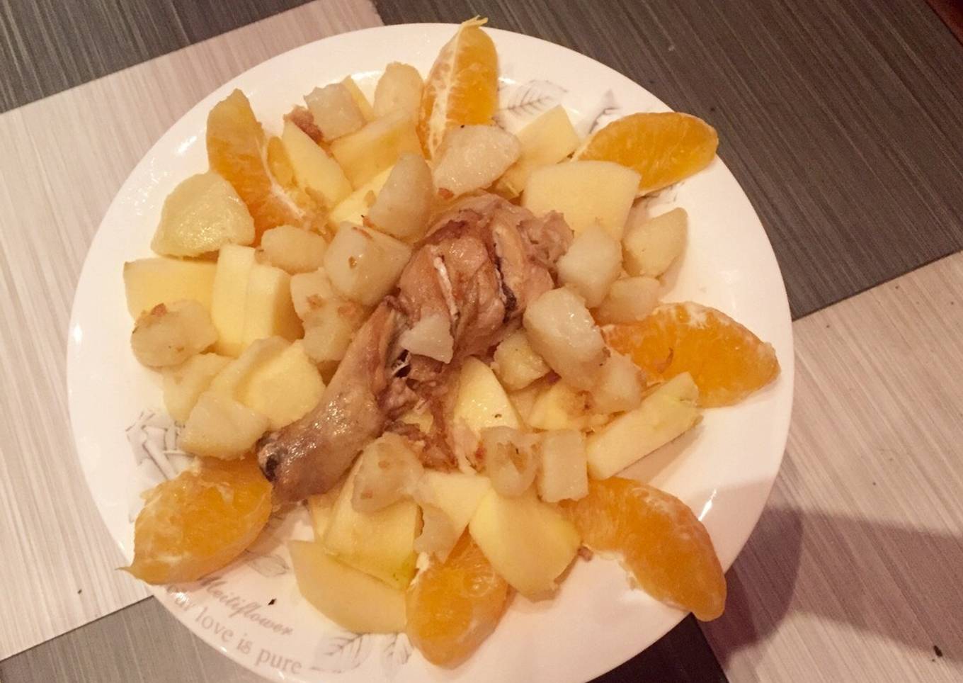 - Ahora cortamos y pelamos en cuadros la naranja y la manzana y mezclamos junto al pollo con papa.